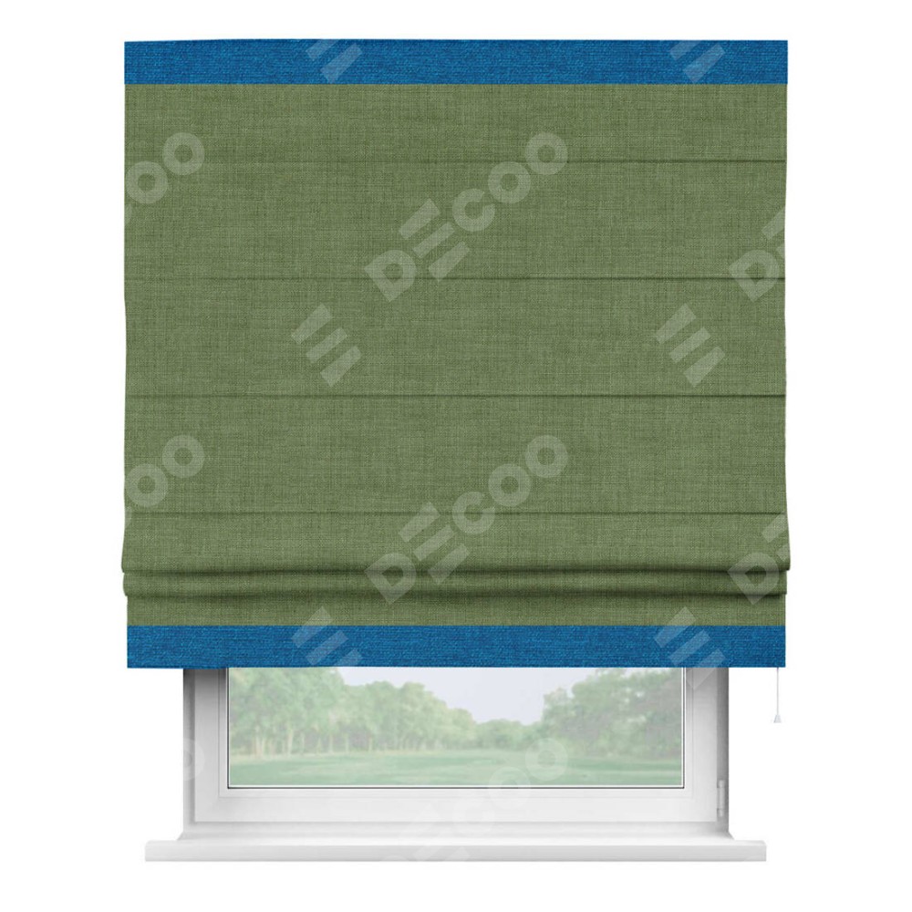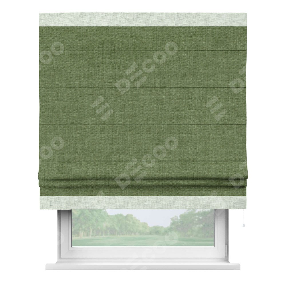 Классическая римская штора производителя «Cortin», пошита из ткани лён зелёный, артикул: 131547. Имеет универсальный механизм и подходит для монтажа: на потолок, на стену и в нишу.