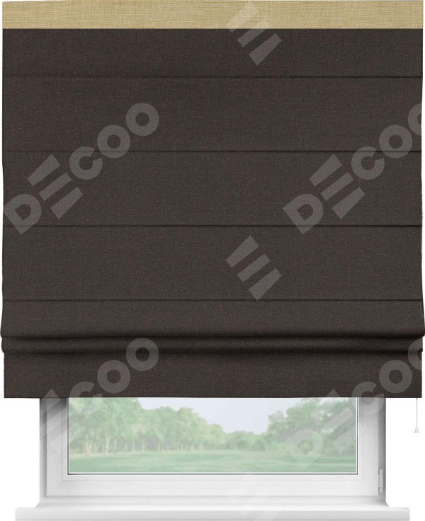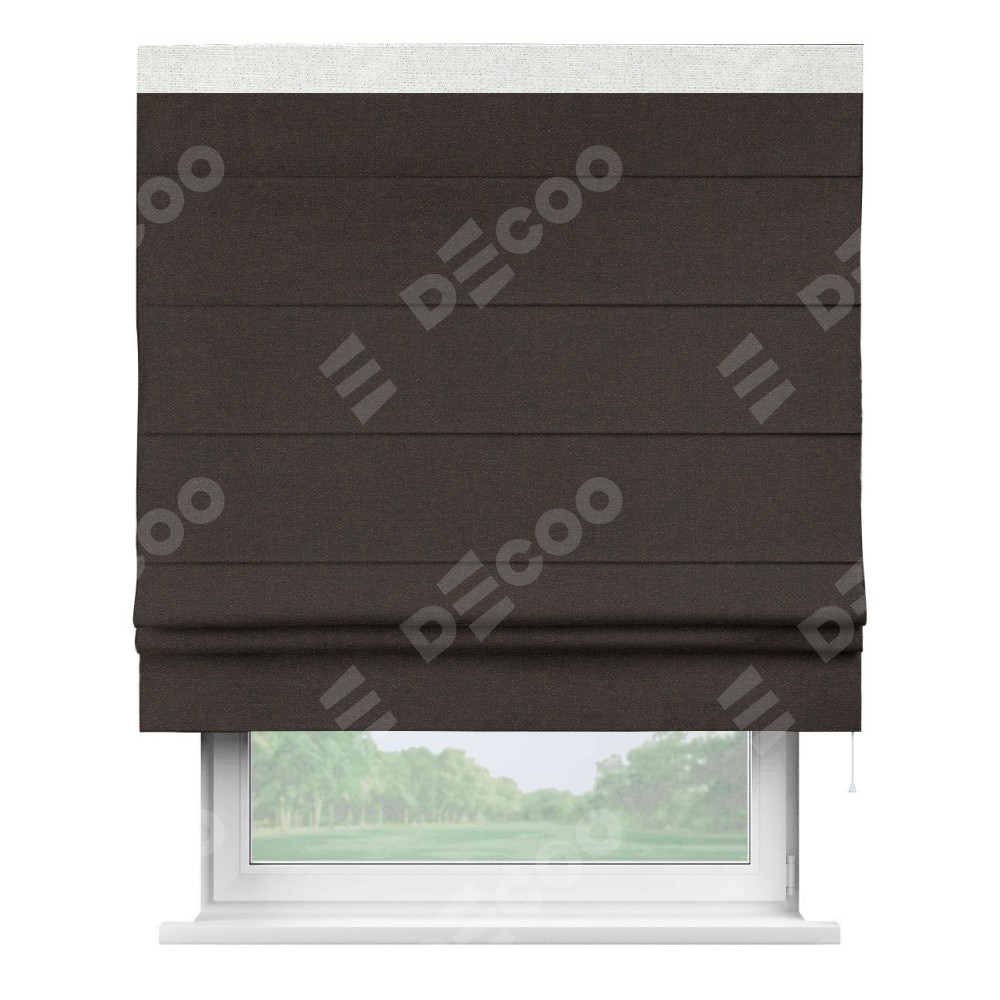 Классическая римская штора производителя «Cortin», пошита из ткани лён тёмно-коричневый, артикул: 104497. Имеет универсальный механизм и подходит для монтажа: на потолок, на стену и в нишу.