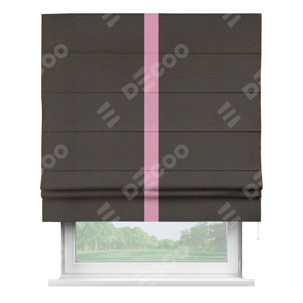 Римская штора производителя «Cortin», используется для проёма, пошита из ткани лён димаут венге, артикул 85410. Отделка шторы кантом «Хайвэй», ткань для канта используется из льна димаут разной расцветки на выбор. Имеет универсальный механизм и подходит для монтажа: на потолок, на стену и в нишу.