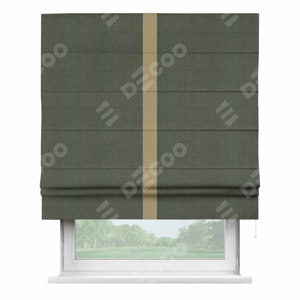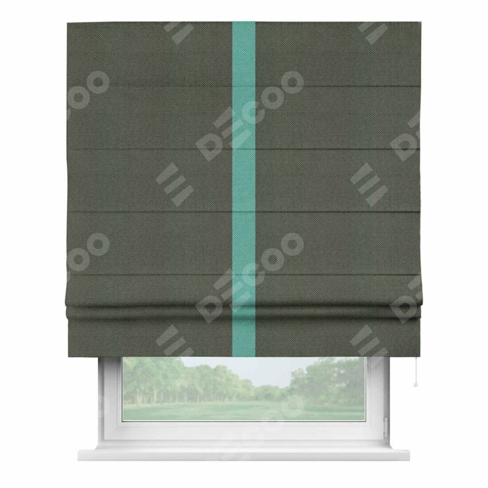 Римская штора производителя «Cortin», используется для проёма, пошита из ткани лён димаут графит, артикул 27. Отделка шторы кантом «Хайвэй», ткань для канта используется из льна димаут разной расцветки на выбор. Имеет универсальный механизм и подходит для монтажа: на потолок, на стену и в нишу.