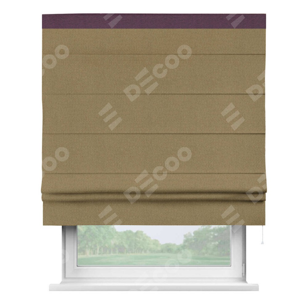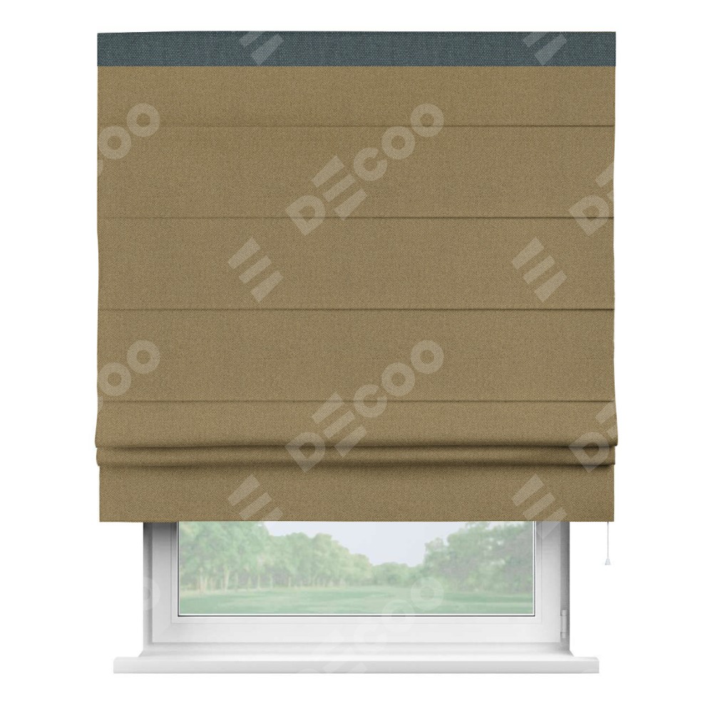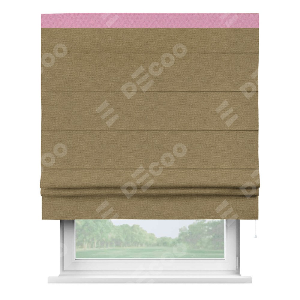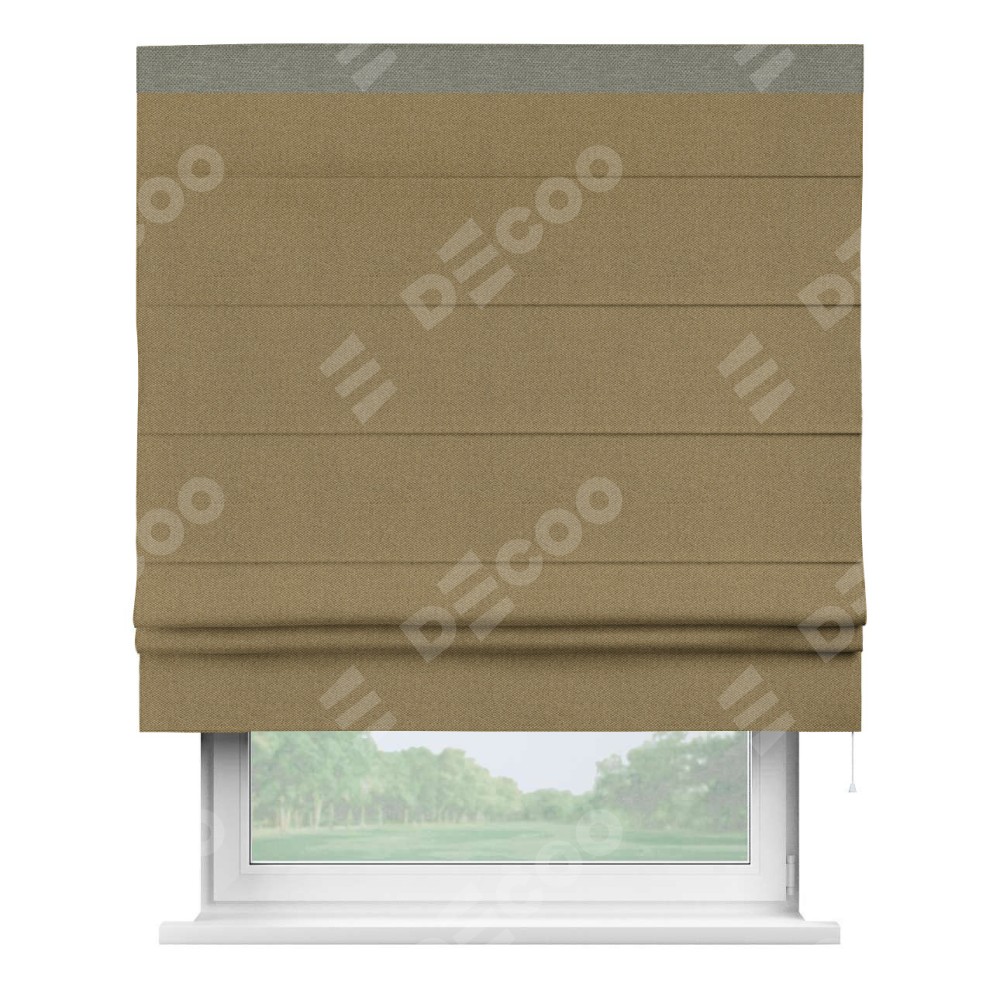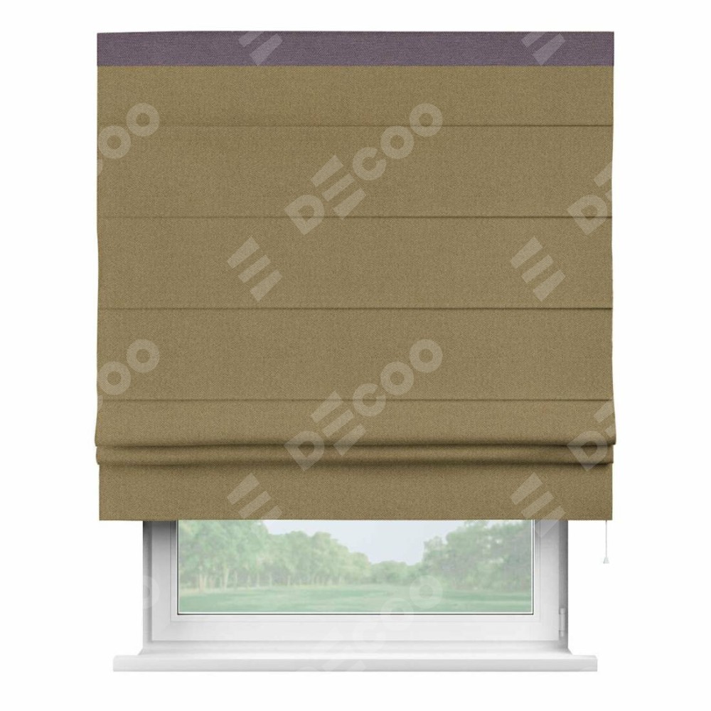 Римская штора производителя «Cortin», используется для проёма, пошита из ткани лён димаут оливковый, артикул 16243. Отделка шторы кантом «Кинг», ткань для канта используется из льна димаут разной расцветки на выбор. Имеет универсальный механизм и подходит для монтажа: на потолок, на стену и в нишу.
