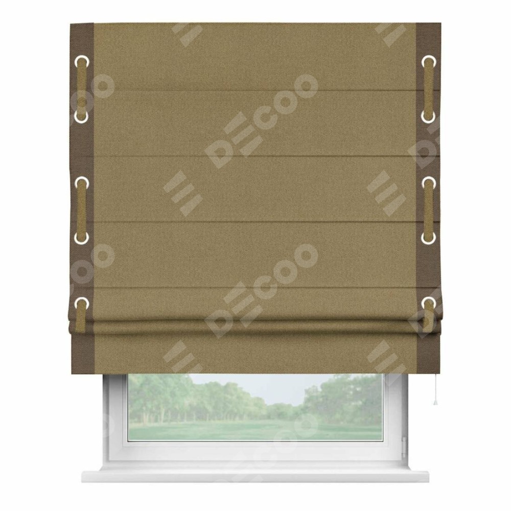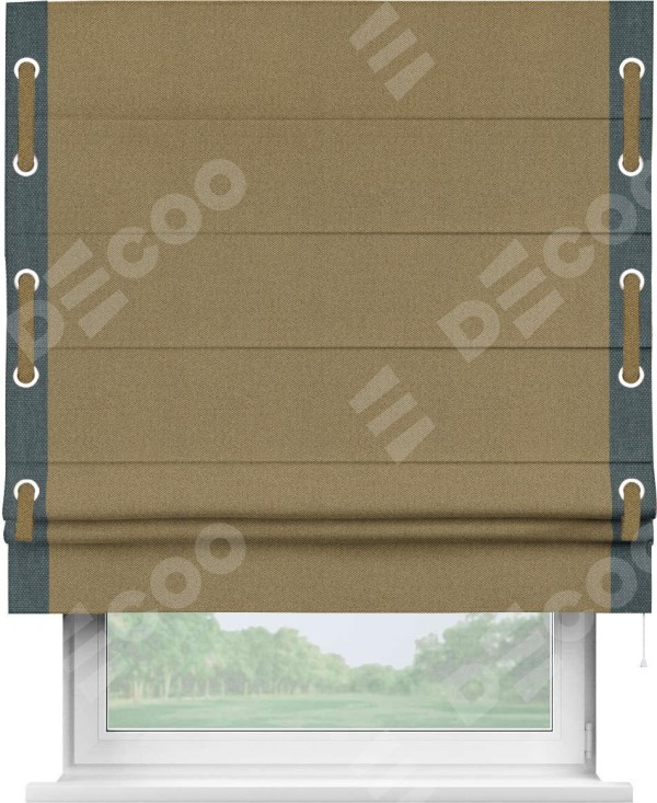 Римская штора производителя «Cortin», используется для проёма, пошита из ткани лён димаут оливковый, артикул 16243. Отделка шторы кантом «Стрим Дуо» на кантах расположены люверсы с пояском, ткань для канта используется лён димаут разной расцветки на выбор. Ткань для пояска обычно используется из основной ткани шторы, а так же можно сделать из любой расцветки по желанию. Имеет универсальный механизм и подходит для монтажа: на потолок, на стену и в нишу.