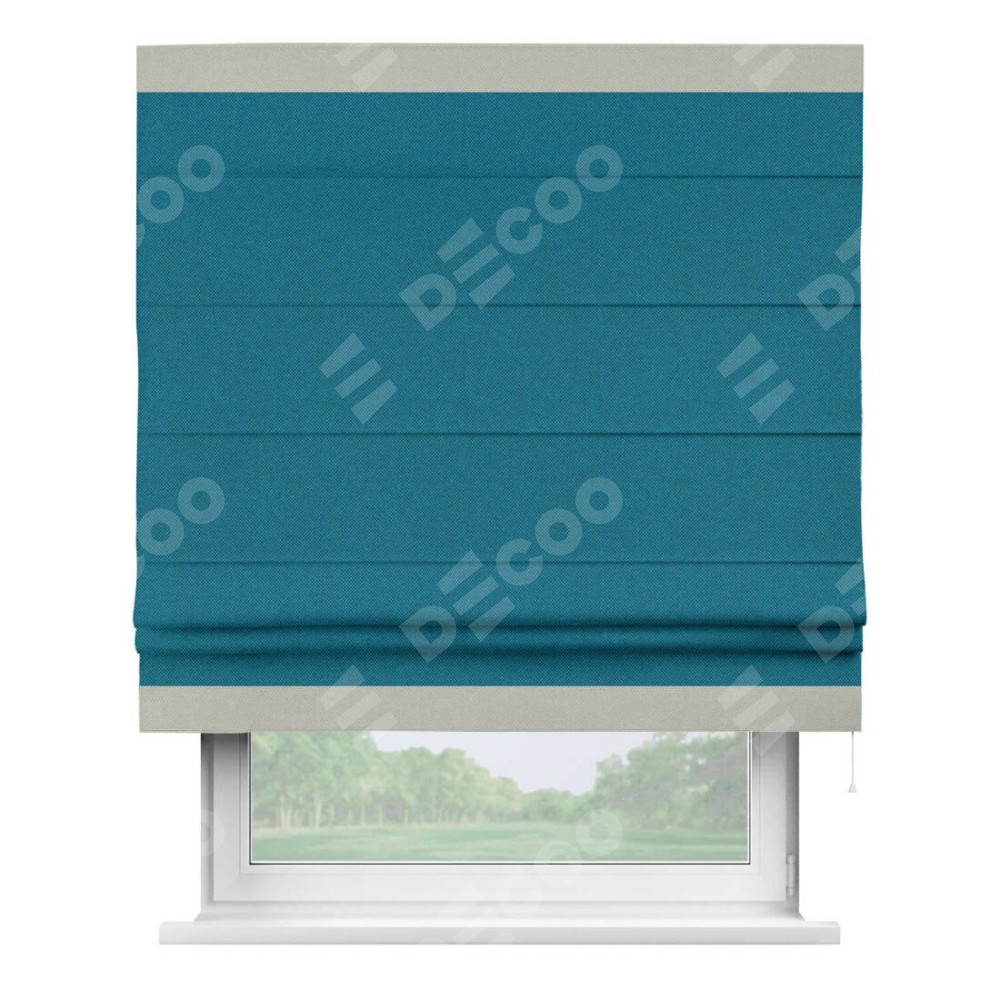 Римская штора производителя «Cortin», используется для проёма, пошита из ткани лён димаут светло-синий, артикул 02. Отделка шторы кантом «Горизонт», ткань для канта используется из льна димаут разной расцветки на выбор. Имеет универсальный механизм и подходит для монтажа: на потолок, на стену и в нишу.
