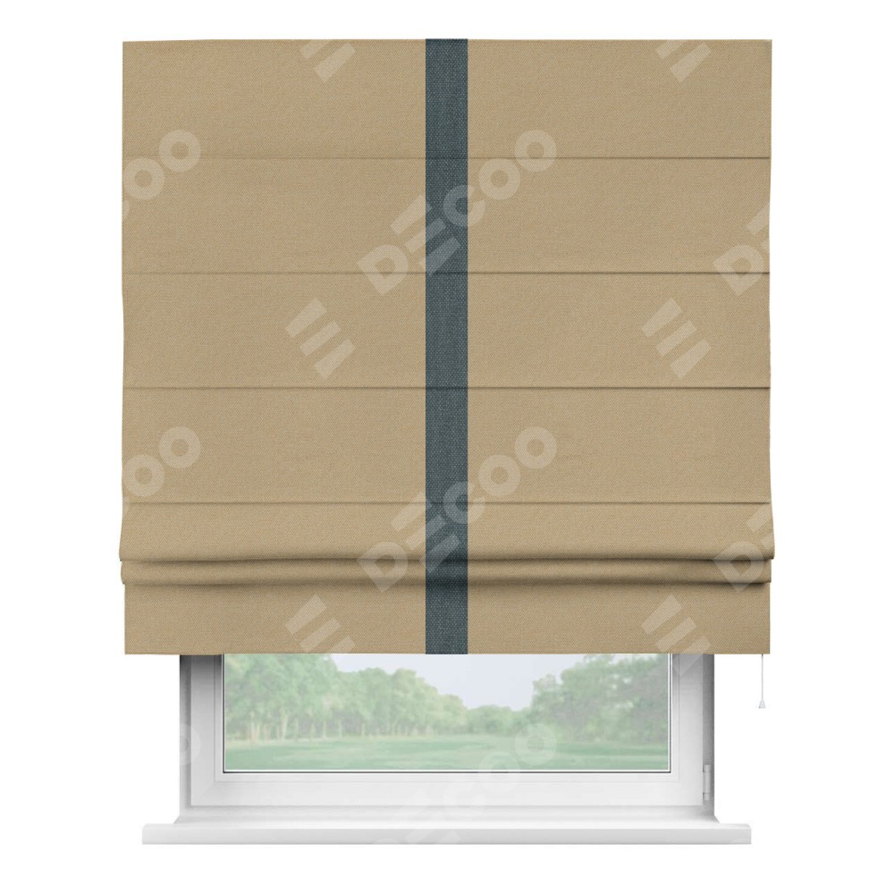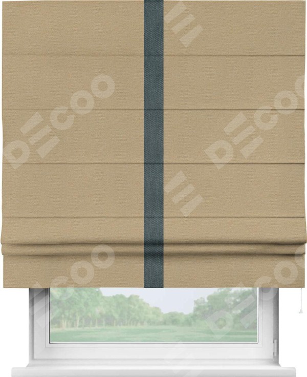 Римская штора производителя «Cortin», используется для проёма, пошита из ткани лён димаут тёмно-бежевый, артикул 83 037. Отделка шторы кантом «Хайвэй», ткань для канта используется из льна димаут разной расцветки на выбор. Имеет универсальный механизм и подходит для монтажа: на потолок, на стену и в нишу.