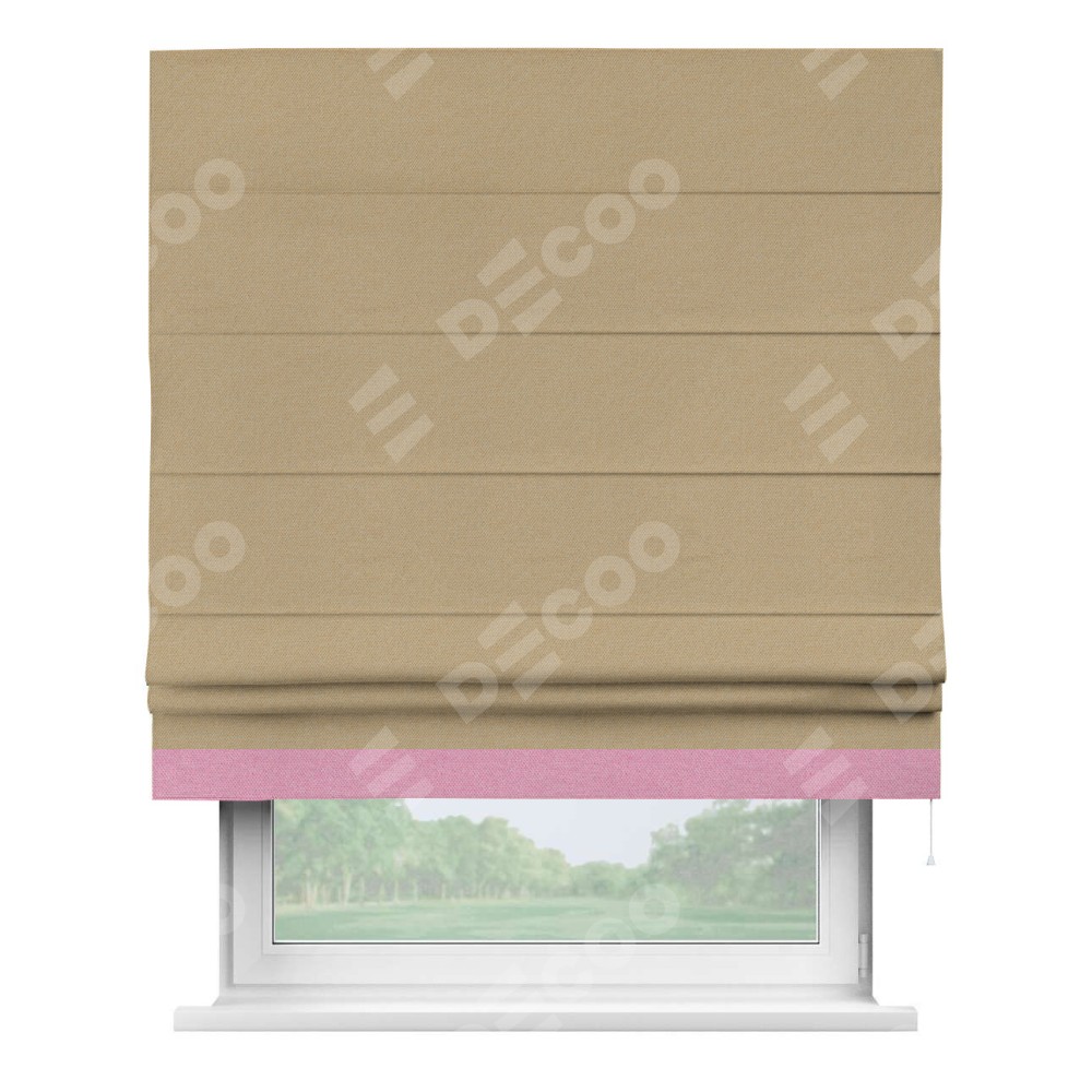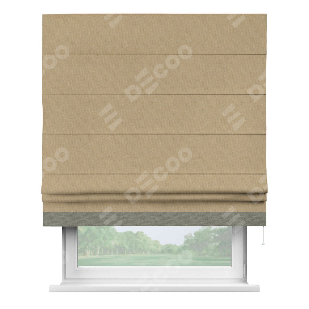 Римская штора производителя «Cortin», используется для проёма, пошита из ткани лён димаут тёмно-бежевый, артикул 83037. Отделка шторы кантом «Джестер», ткань для канта используется из льна димаут разной расцветки на выбор. Имеет универсальный механизм и подходит для монтажа: на потолок, на стену и в нишу.