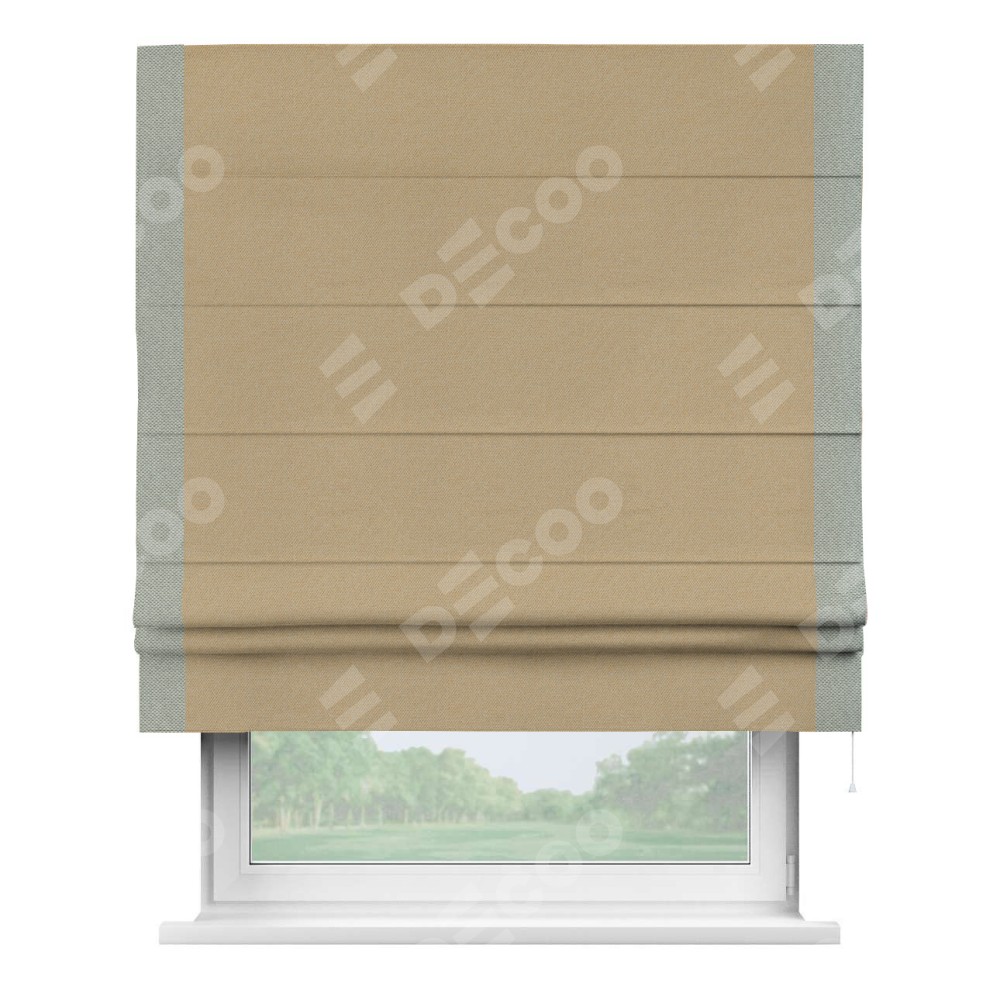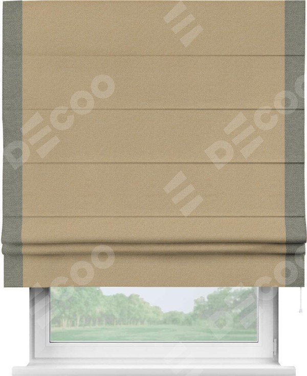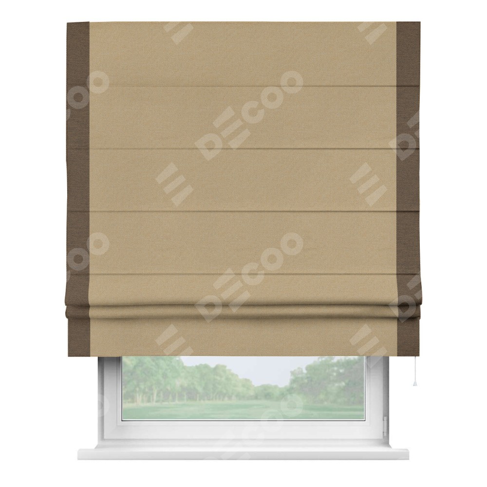 Римская штора производителя «Cortin», используется для проёма, пошита из ткани лён димаут тёмно-бежевый, артикул 83037. Отделка шторы кантом «Стрим Дуо», ткань для канта используется из льна димаут разной расцветки на выбор. Имеет универсальный механизм и подходит для монтажа: на потолок, на стену и в нишу.