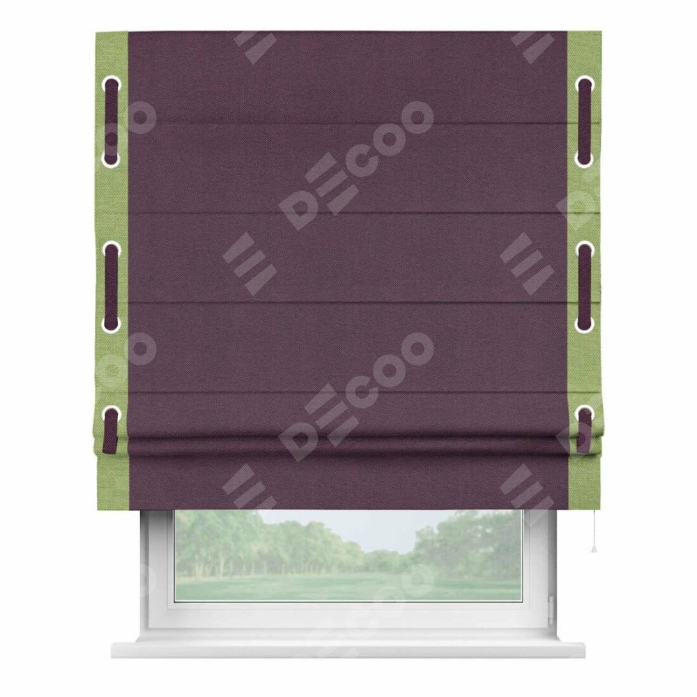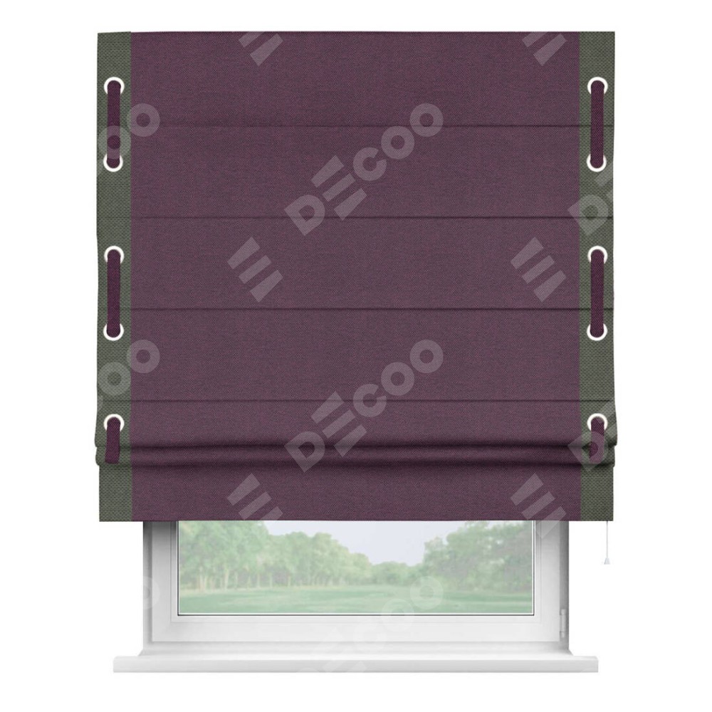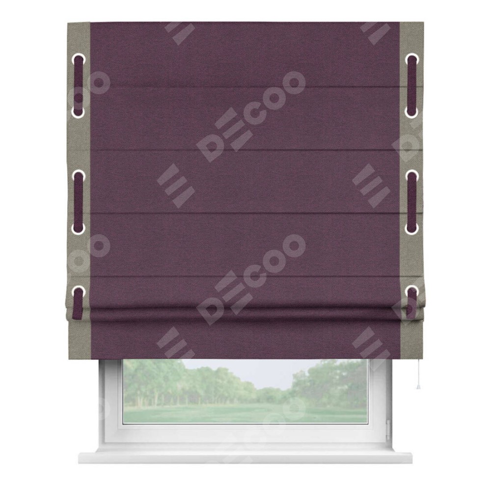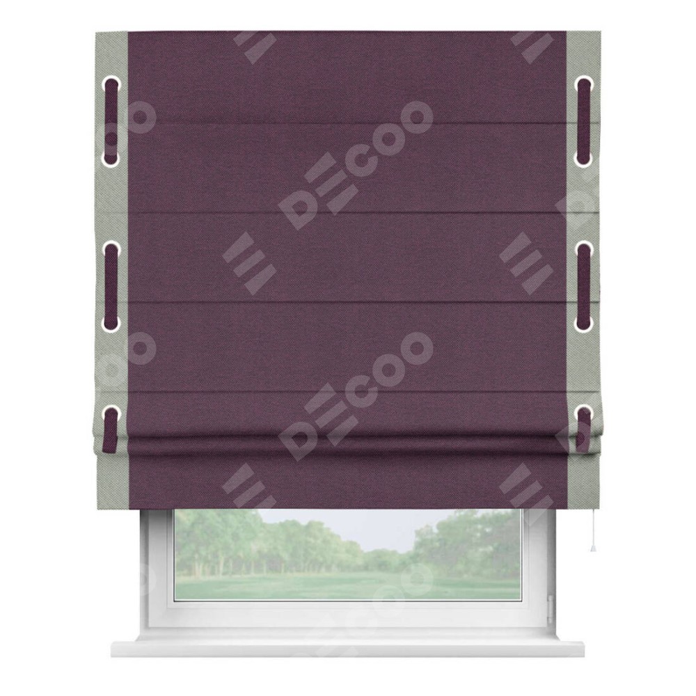 Римская штора производителя «Cortin», используется для проёма, пошита из ткани лён димаут фиолетовый, артикул 8817. Отделка шторы кантом «Стрим Дуо» на кантах расположены люверсы с пояском, ткань для канта используется лён димаут разной расцветки на выбор. Ткань для пояска обычно используется из основной ткани шторы, а так же можно сделать из любой расцветки по желанию. Имеет универсальный механизм и подходит для монтажа: на потолок, на стену и в нишу.