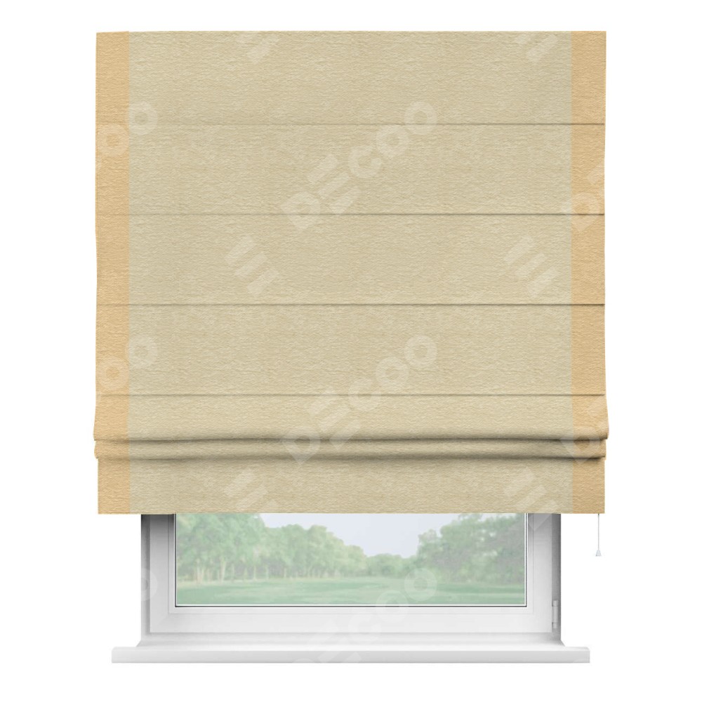 Римская штора производителя «Cortin», используется для проёма, пошита из ткани софт однотонный светло-бежевый, артикул 54426. Отделка шторы кантом «Стрим Дуо», ткань для канта используется из софта разной расцветки на выбор. Имеет универсальный механизм и подходит для монтажа: на потолок, на стену и в нишу.