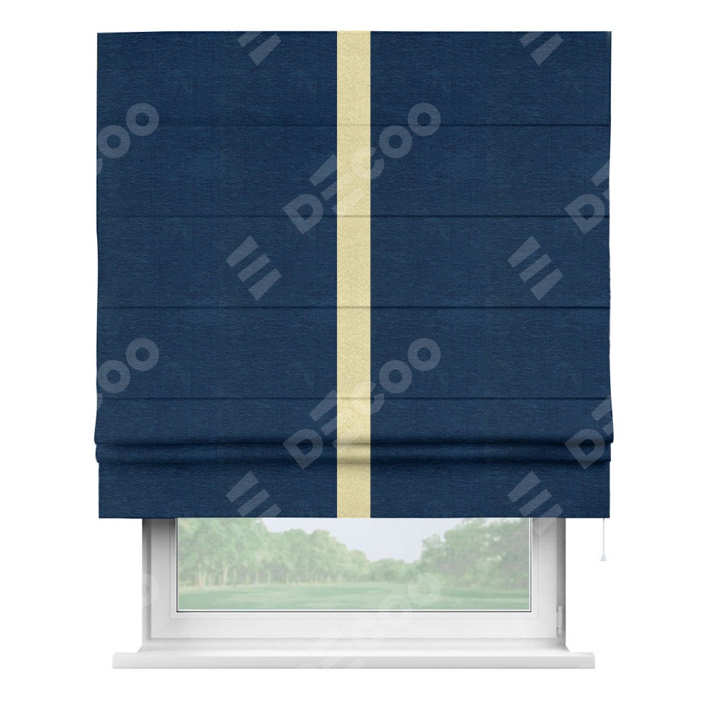 Римская штора производителя «Cortin», используется для проёма, пошита из ткани софт однотонный синий, артикул 42937. Отделка шторы кантом «Хайвэй», ткань для канта используется из софта разной расцветки на выбор. Имеет универсальный механизм и подходит для монтажа: на потолок, на стену и в нишу.