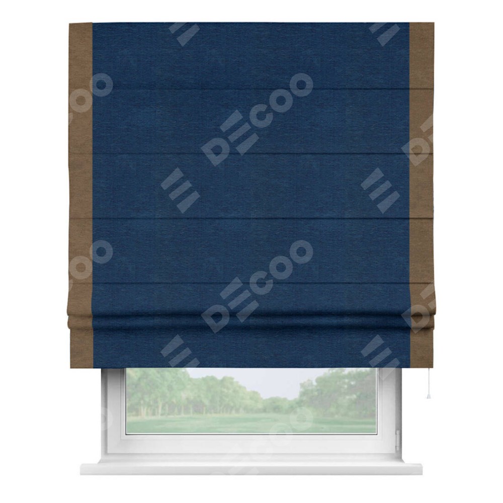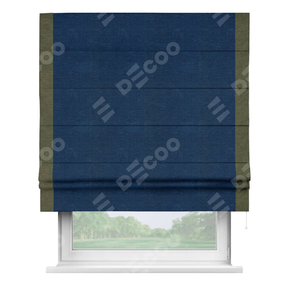Римская штора производителя «Cortin», используется для проёма, пошита из ткани софт однотонный синий, артикул 42937. Отделка шторы кантом «Стрим Дуо», ткань для канта используется из софта разной расцветки на выбор. Имеет универсальный механизм и подходит для монтажа: на потолок, на стену и в нишу.