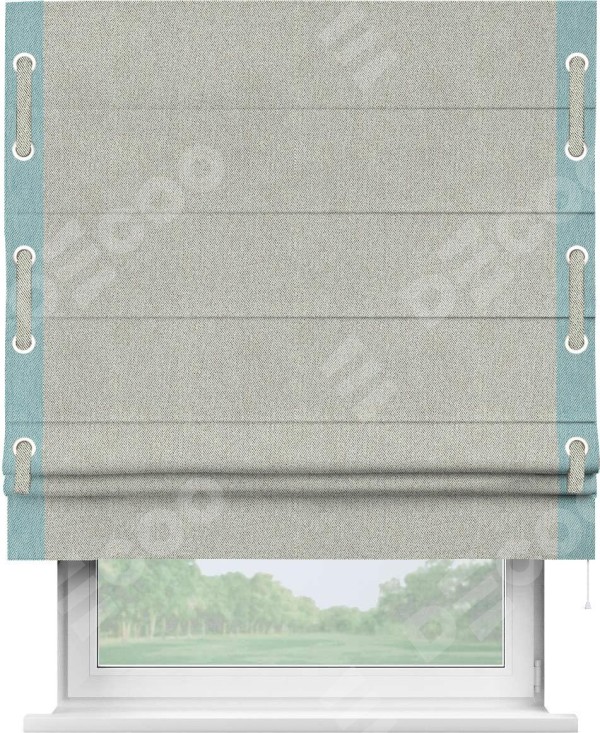 Римская штора производителя «Cortin», используется для проёма, пошита из ткани твид блэкаут глубокий коричнево-серый, артикул 21574. Отделка шторы кантом «Стрим Дуо» на кантах расположены люверсы с пояском, ткань для канта используется из твида разной расцветки на выбор. Ткань для пояска обычно используется из основной ткани шторы, а так же можно сделать из любой расцветки по желанию. Имеет универсальный механизм и подходит для монтажа: на потолок, на стену и в нишу.