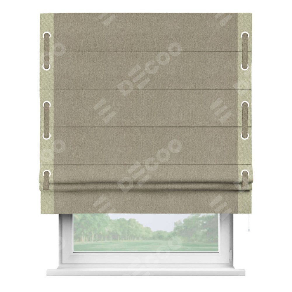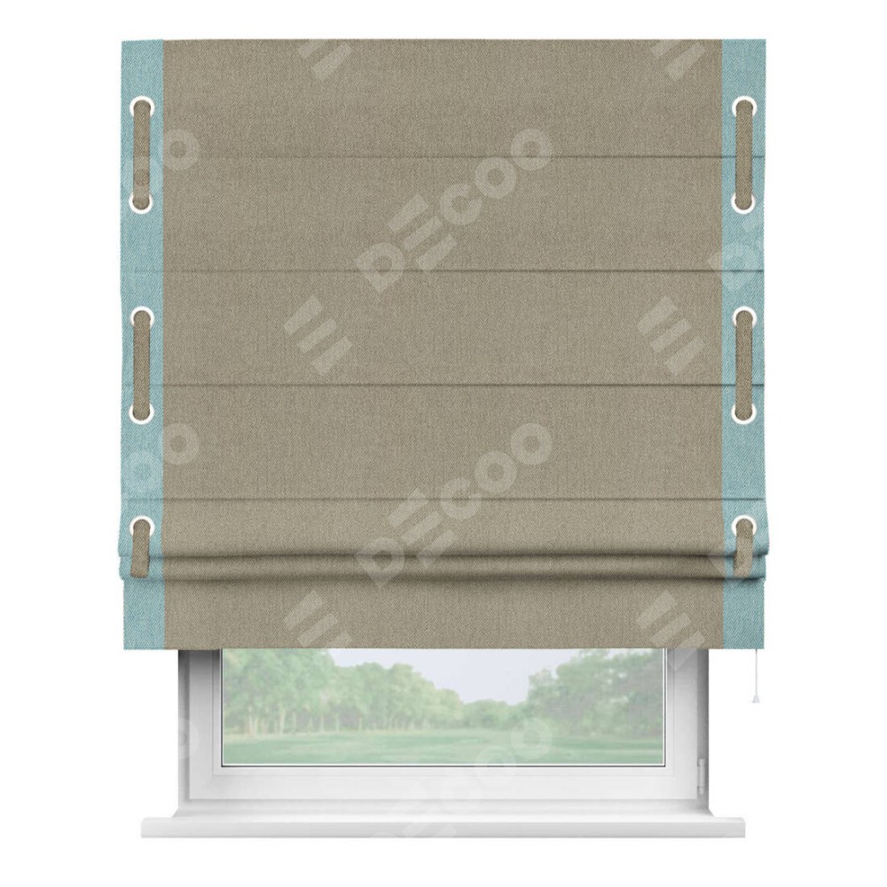 Римская штора производителя «Cortin», используется для проёма, пошита из ткани твид блэкаут кофе, артикул 21575. Отделка шторы кантом «Стрим Дуо» на кантах расположены люверсы с пояском, ткань для канта используется из твида разной расцветки на выбор. Ткань для пояска обычно используется из основной ткани шторы, а так же можно сделать из любой расцветки по желанию. Имеет универсальный механизм и подходит для монтажа: на потолок, на стену и в нишу.