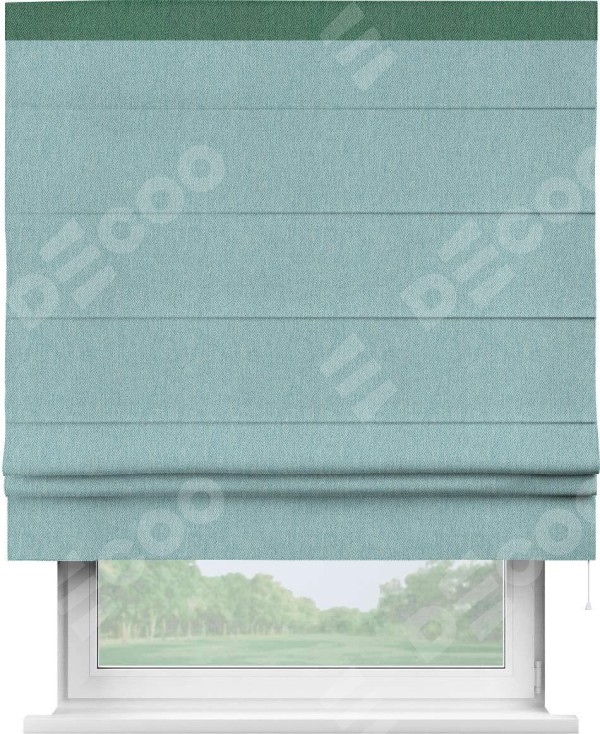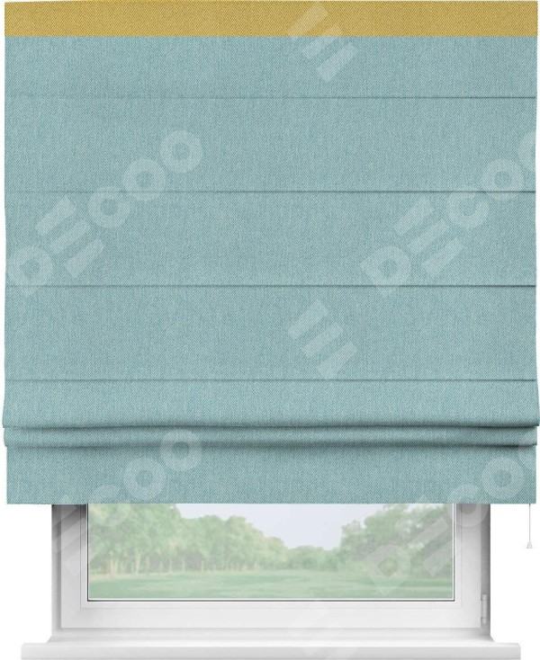 Римская штора производителя «Cortin», используется для проёма, пошита из ткани твид блэкаут небесно-голубой, артикул 21578. Отделка шторы кантом «Кинг», ткань для канта используется из твида разной расцветки на выбор. Имеет универсальный механизм и подходит для монтажа: на потолок, на стену и в нишу.