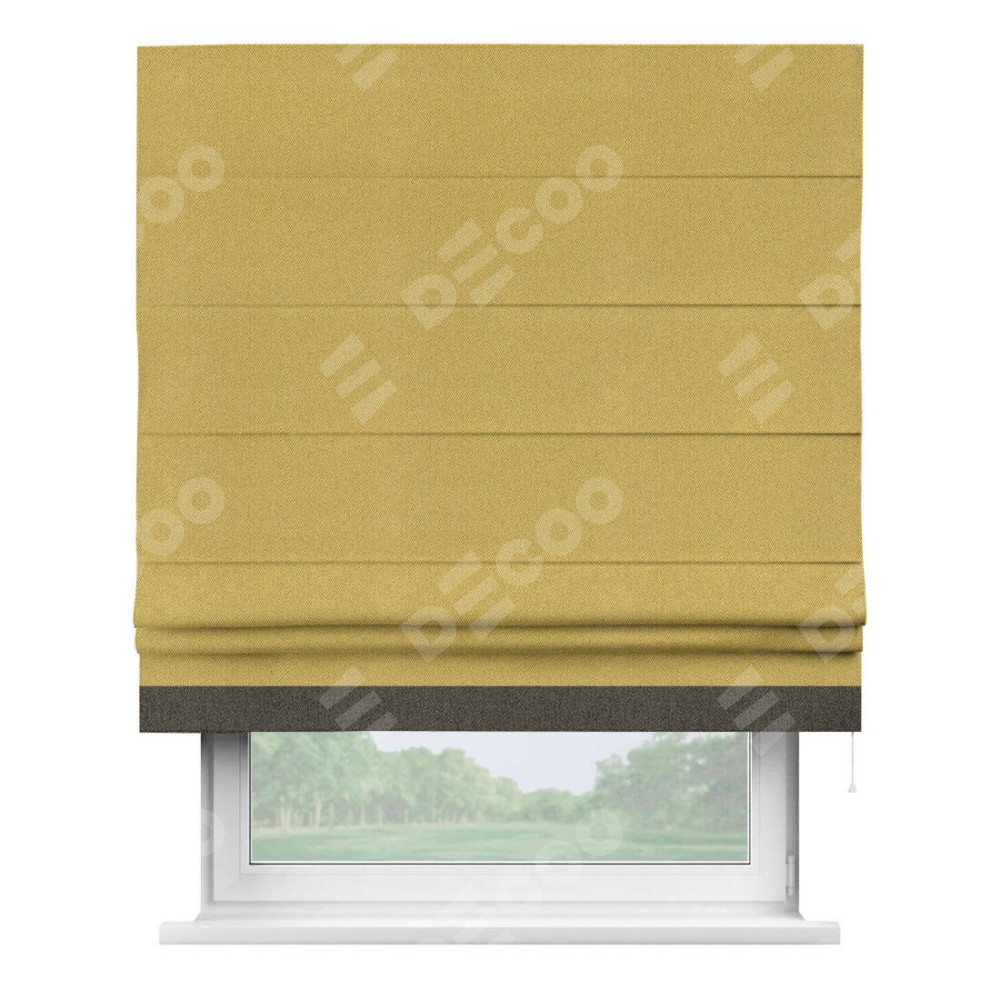 Римская штора производителя «Cortin», используется для проёма, пошита из ткани твид блэкаут пыльная горчица, артикул 21588. Отделка шторы кантом «Джестер», ткань для канта используется из твида разной расцветки на выбор. Имеет универсальный механизм и подходит для монтажа: на потолок, на стену и в нишу.