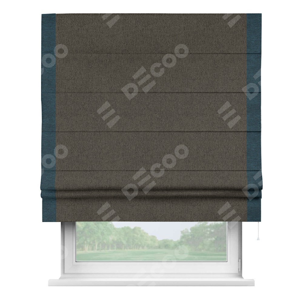 Римская штора производителя «Cortin», используется для проёма, пошита из ткани твид блэкаут тёмно-коричневый, артикул 21584. Отделка шторы кантом «Стрим Дуо», ткань для канта используется из твида разной расцветки на выбор. Имеет универсальный механизм и подходит для монтажа: на потолок, на стену и в нишу.
