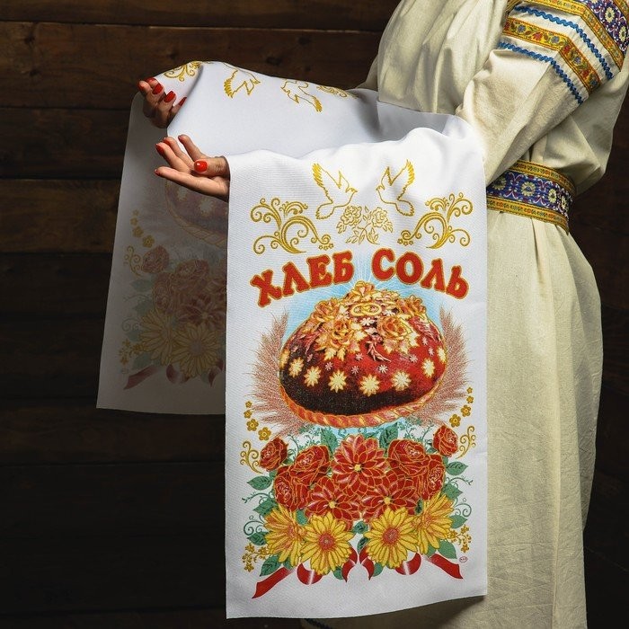 Рушник под ноги. Кто первым из молодых на него встанет — тому и быть хозяином в доме. Лучше отказаться от вариантов, на которых изображена пара голубей или лебедей, а также кольца. Считается, что супруги могут затоптать своё счастье. Лучше отдать предпочтение геометрическим или растительным узорам.