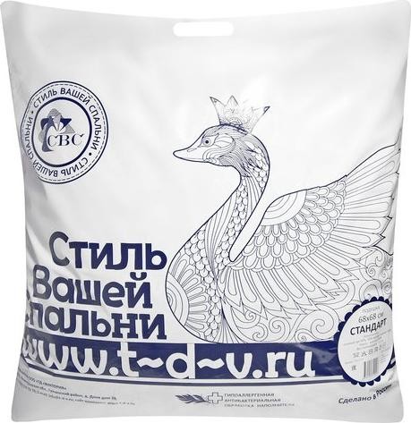 Ткань верха: пуходержащий хлопковый тик. Наполнитель: пухоперовая смесь (пух — 30%, перо — 70%). Кант: х/б, атласная этикетка-уголок с логотипом «СВС» на сатине. Поставляется в фирменном пакете с ручкой.