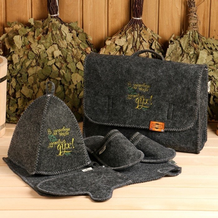 В портфеле можно хранить банные принадлежности и средства личной гигиены. Банная шапка защитит голову от перегрева, волосы от ломкости, а рукавица — от случайных ожогов.