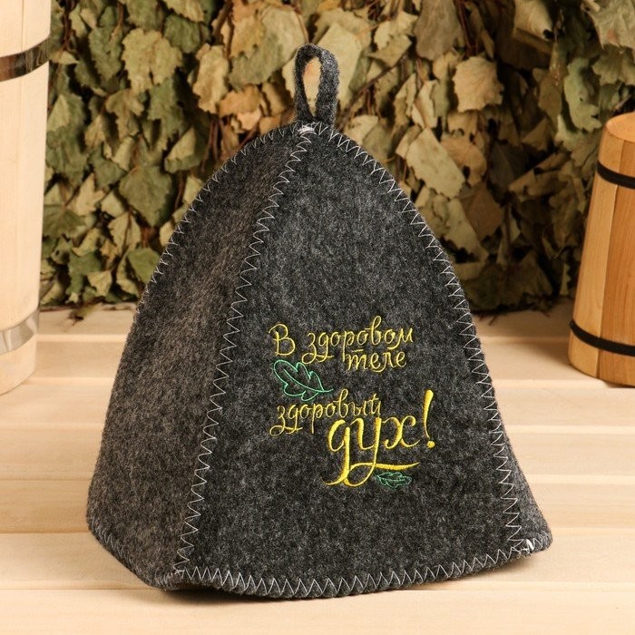 • банная шапка с вышивкой «В здоровом теле здоровый дух»;